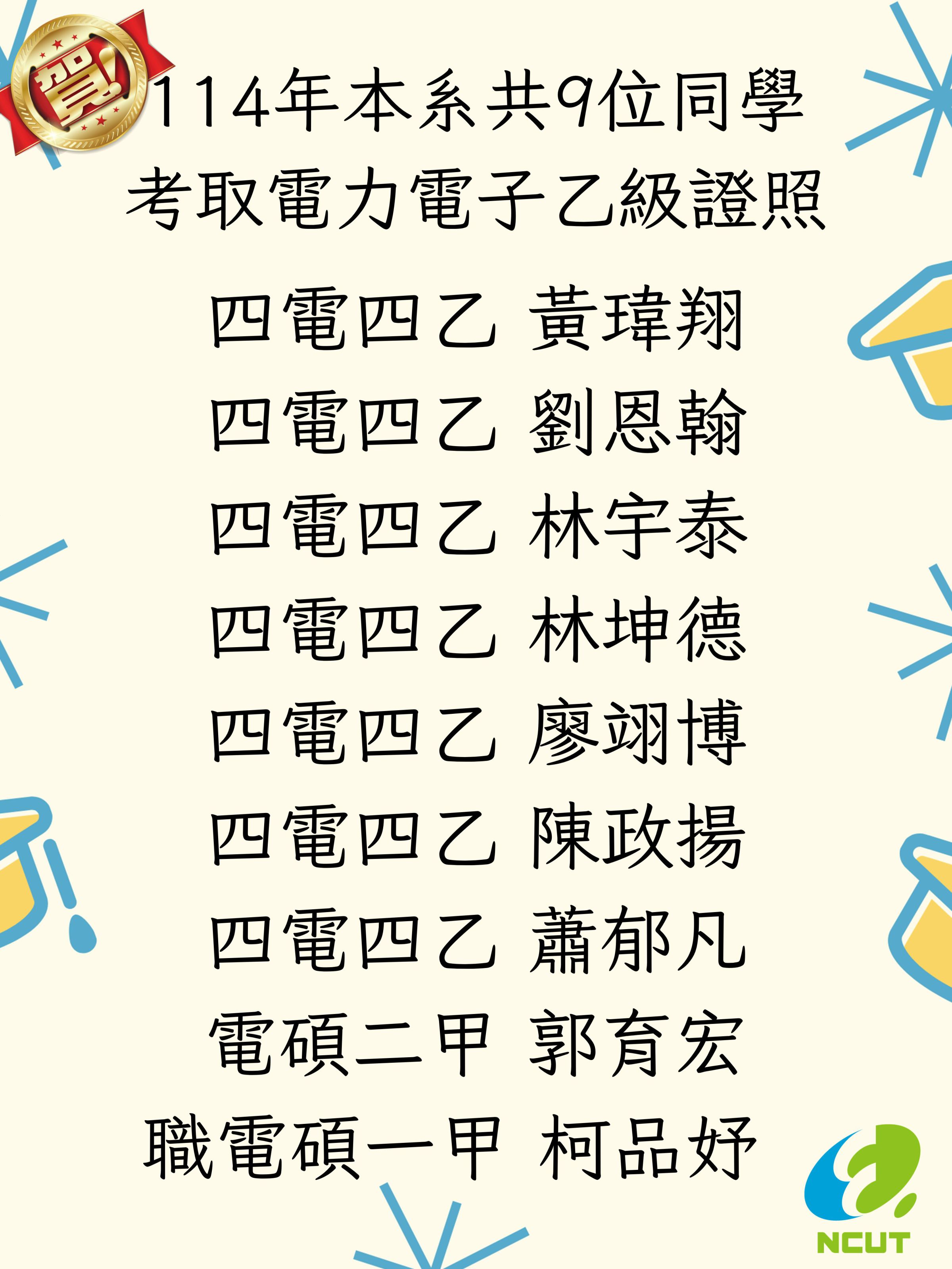 賀!本系114年共9位同學考取電力電子乙級證照!